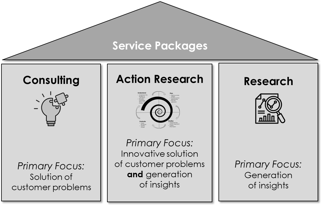 Research collaborations pursue the primary goal of gaining insights into the symptoms and causes of problems and/or the effectiveness of innovative approaches and measures. Only expense allowances, travel costs and other expenses are charged for these services.