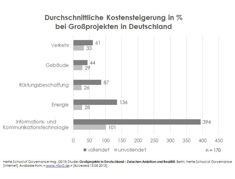 Nach einer Studie der „Hertie School of Governance“ (Kostka & Anzinger 2016), die 170 Infrastruktur-Projekte in Deutschland zwischen 1960 und heute untersuchte, betrugen die Kostensteigerungen der untersuchten Projekte insgesamt 59 Mrd. EUR (statt gepante 141 Mrd. EUR mindestens 200 Mrd. EUR).