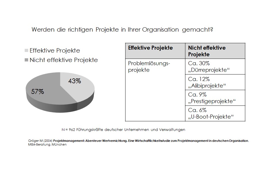 Nach einer älteren Studie, in der 962 Führungskräfte nach der Wertschöpfung interner Projekte in deutschen Unternehmen befragt wurden (Gröger 2004), wird der überwiegende Teil der Projekte als unwirksam bewertet. Gründe dafür sind unzureichende Ressourcenausstattung („Dürreprojekte“), oberflächliches Adressieren von Themen ohne Mehrwert für das Unternehmen („Alibi-Projekte“), bloßes Aufgreifen von Modethemen („Prestige-Projekte“) oder Einzelinitiativen ohne breite Unterstützung („U-Boot-Projekte“). Ein weiterer Teil der Projekte – so vermuten wir – wird zwar als effektiv bewertet, beseitigt jedoch „Verschlimmbesserungen“, die durch Vorgängerprojekte produziert wurden.